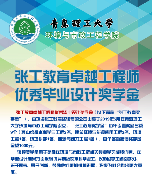 我校给排水83级校友张福先心系教育、情系母校,于2019年在青岛理工大学yl23455永利设立“张工教育卓越工程师优秀毕业设计奖学金”,2019年共有9个毕业设计项目获得奖励,2020年又评出9个获奖优秀毕业设计,分别是给排水科学与工程专业3个:青岛市麦岛污水处理厂提标扩建工程设计(赵洋,毕学军教授指导)、青岛市黄岛区灵山卫排水区排水工程设计(孙文琳,苗群教授指导)、云南腾冲清水乡给排水规划设计(曹海燕,李金成副教授指导);建筑环境与能源应用工程专业3个:重庆某高校教学示范楼空调工程设计(孙德熙,季永明博士指导)、潍坊信圆金融服务中心1号楼空调工程设计(周腾德,崔红社副教授指导)、商丘城市广场空调设计(周思伟,刘国丹教授指导);环境工程专业的青岛某包装印刷厂废气中VOCs处理工艺设计(高燕,张宜升副教授指导),环境科学专业的多级A/O-MBBR工艺对微污染的去除研究(王慧敏,陈栋副教授指导),能源与动力工程专业的小型旋流燃烧器(航空用)的设计(李朝民,张敬奎副教授指导)。