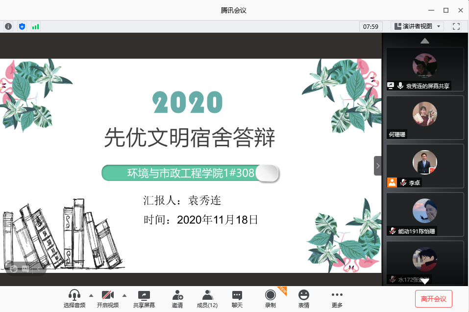 为学习贯彻习近平总书记系列重要讲话精神,积极践行社会主义核心价值观,加强文明公寓、平安公寓建设,yl23455永利于11月18日下午通过腾讯会议举办了线上公寓先优答辩大会。出席本次答辩大会的评委有党总支副书记邵长飞,辅导员李卓、何珊珊,会议由李卓主持。