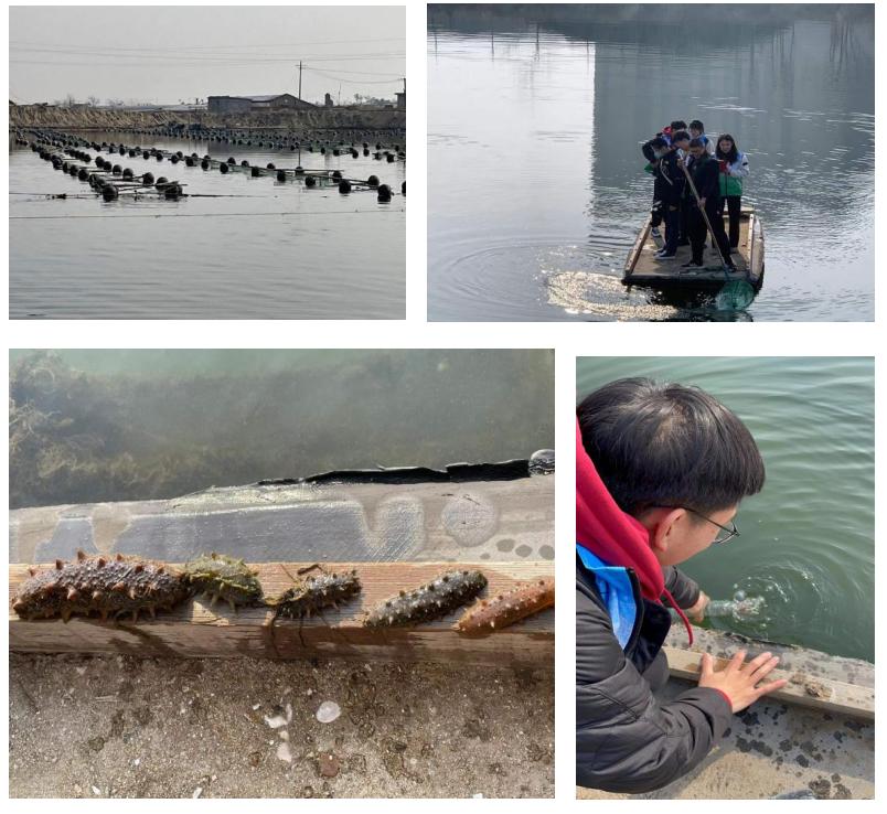 发挥专业优势,助力家乡产业。拜访完老党员后,团队一行人辗转来到乳山市徐家镇牡蛎海参养殖基地。基地负责人徐俊军对实践团队的到来表示热烈欢迎,并从当地地理位置、海域环境、气候条件、政策优势等方面介绍了牡蛎和海参养殖的基本发展情况。随后团队成员深入牡蛎海参养殖池,探究和学习乡村产业振兴的奥秘。