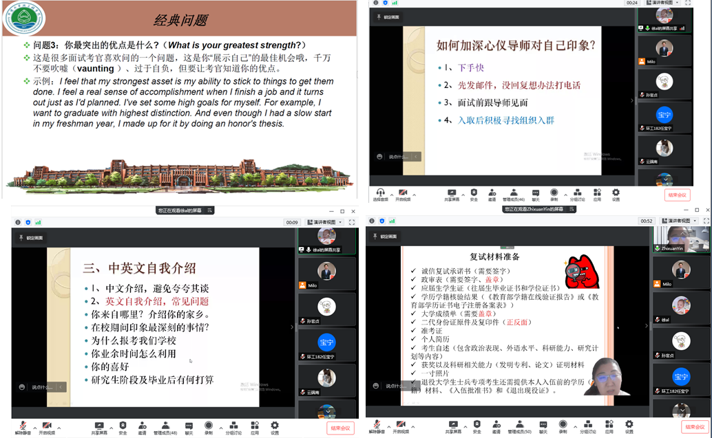 学院还组织了经验丰富的专业任课教师徐爱玲和尹志轩为同学做复试专题讲座。从信息收集、导师联系、复试流程等方面对学生进行详细讲解,指导学生如何应对线上面试的突发情况,积极解答同学们关心的实际问题,讲座起到了良好的面试助推作用。