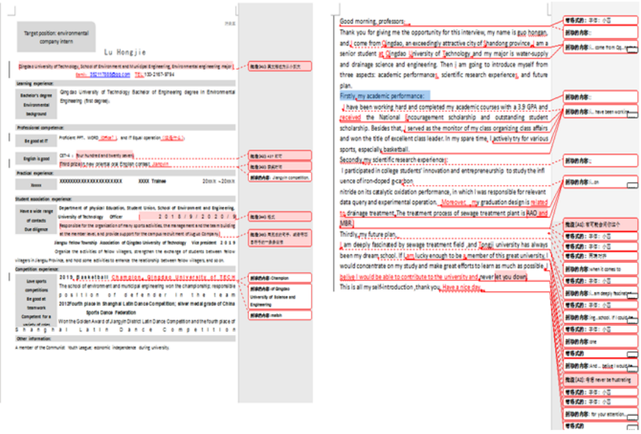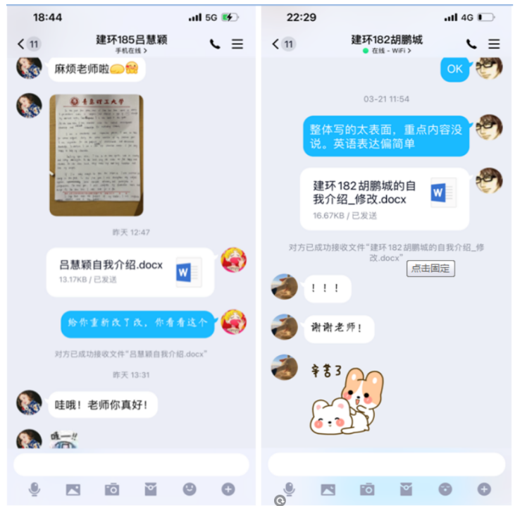 一对一指导,全力解决学生实际困难。“老师,复试英语口语的自我介绍能帮我改一下吗?”面对同学们的需求,“没问题”是最响亮的回答。李卓、何珊珊、宫克菲充分发挥专业优势,为考研复试学子举行了线上英语复试面试讲解,从考研英语的考查形式,笔试、口语、听力复试准备的流程到专业英语词汇等方面内容,逐一进行了详细的讲解。对于部分同学,李卓进行一对一的指导,一句句的进行手写讲解、标注,力求做到讲透,弄懂,会用。