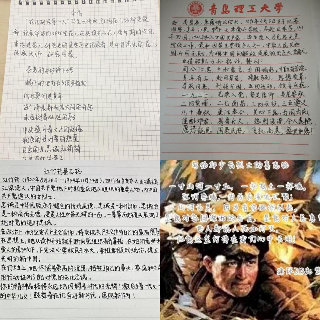 祭英烈 同学们通过“中华英烈网”进行线上祭奠英烈,为英雄敬献花篮,并举办“颂公千秋史,寄君墓志铭”活动,号召同学们以撰写墓志铭的形式对英烈寄托哀思。