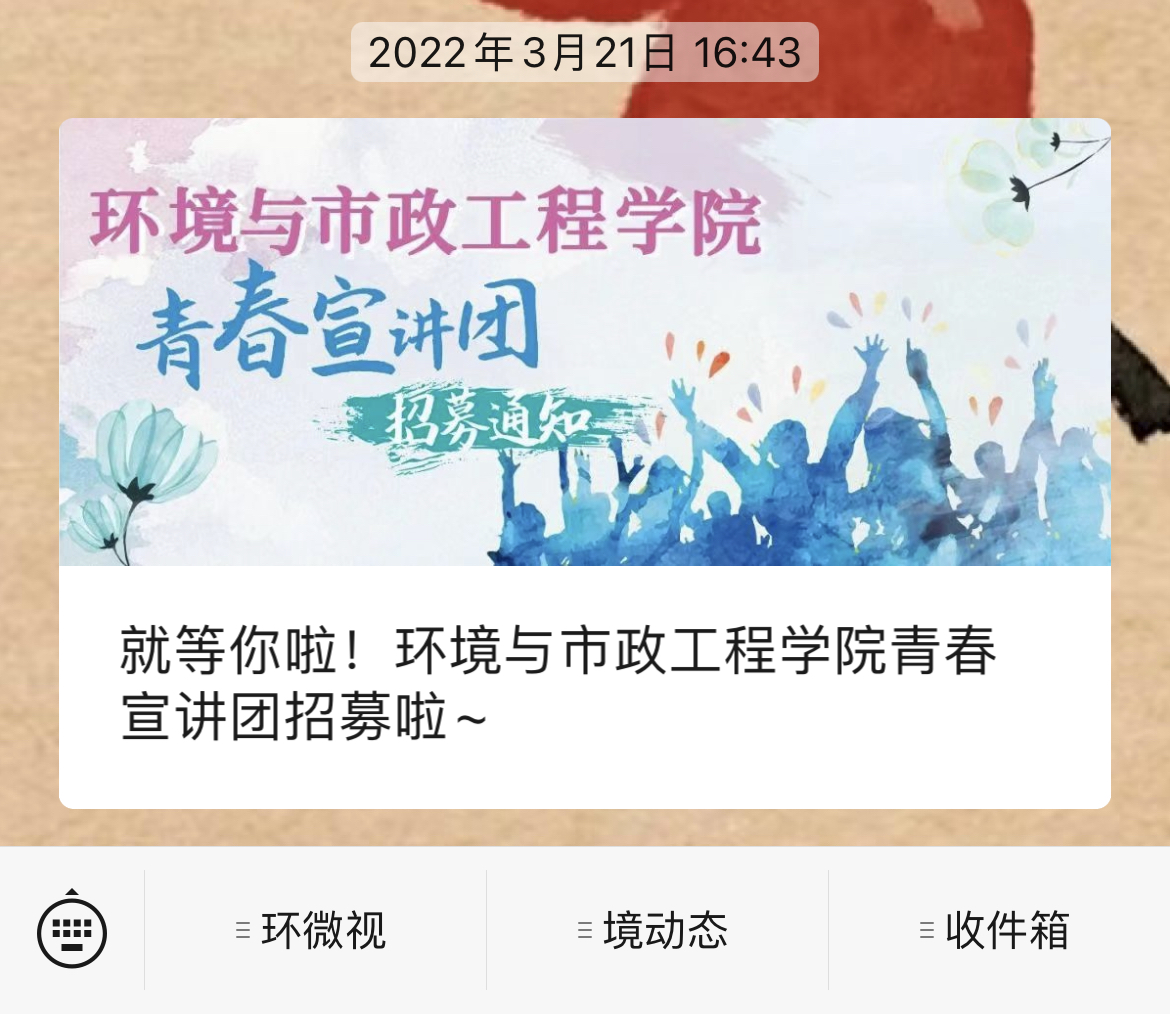 yl23455永利青春宣讲团共设思想引领,学风领航,科技创新、志愿服务、社会实践、文体活动六个分团,招募政治立场坚定、学习成绩优异、科研能力突出、志愿服务经验丰富、积极参加社会实践及文体活动、刻苦努力,执着坚毅,追求卓越,全面发展的优秀环境学子,以优秀学子的典范力量激励一届又一届环境学子奋发图强。