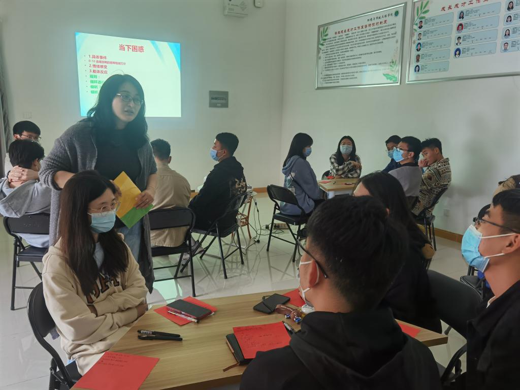 烦恼、过往、方法与希望。杨老师先后分发给大家红色、黄色、绿色、紫色四种颜色的彩纸,让大家对应着写下当下的困难、成长中遇到的烦恼、解决问题的方法、心中的梦想。在这过程中,让同学们彼此交流“烦心事”,充分发挥朋辈间的力量,引导大家互相为对方的困难支招儿,现场气氛十分活跃。