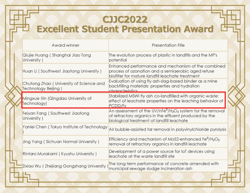 中日双方的专家学者和环保领域业界代表围绕当前固体废物处理处置领域技术发展和面临的相关问题展开了深入探讨和交流。大会围绕焚烧和热处理、焚烧残余物稳定化、污染物浸出行为和无害化处理、填埋场管理、垃圾填埋场监测、物联网利用和塑料废物现状、渗滤液处理及有机废物处理和回收、填埋气回收和温室气体减排等主题进行了专题汇报。yl23455永利副院长孙英杰受邀为焚烧残余物稳定化分会场主席,王华伟副教授、卞荣星副教授及博士生辛明学分别进行了题为“Simultaneous degradation of refractory organics,antibiotics and antibiotic resistance genes from landfill leachate concentrate by GAC/O3”、“Influence of the classification of municipal solid waste on the reduction of greenhouse gas emissions: A case study of Qingdao City, China” 及 “Stabilized Fly Ash Co-landfilled with Organic Waste: Effect of Leachate Properties on the Leaching Behavior of PCDD/Fs” 的口头报告。辛明学博士获得Excellent Student Presentation Award。此外,王亚楠副教授、硕士研究生于倩雯和张听雪分别进行了题为“Insights into the landfill leachate properties and bacterial structure succession resulting from the colandfilling of municipal solid waste and incineration bottom ash”,“Leaching behavior of heavy metals from broken ton bags filled with fly ash in acid rain environment” 及 “Estimation of greenhouse gas emissions from municipal solid waste disposal in China during the last decade”的海报展示。