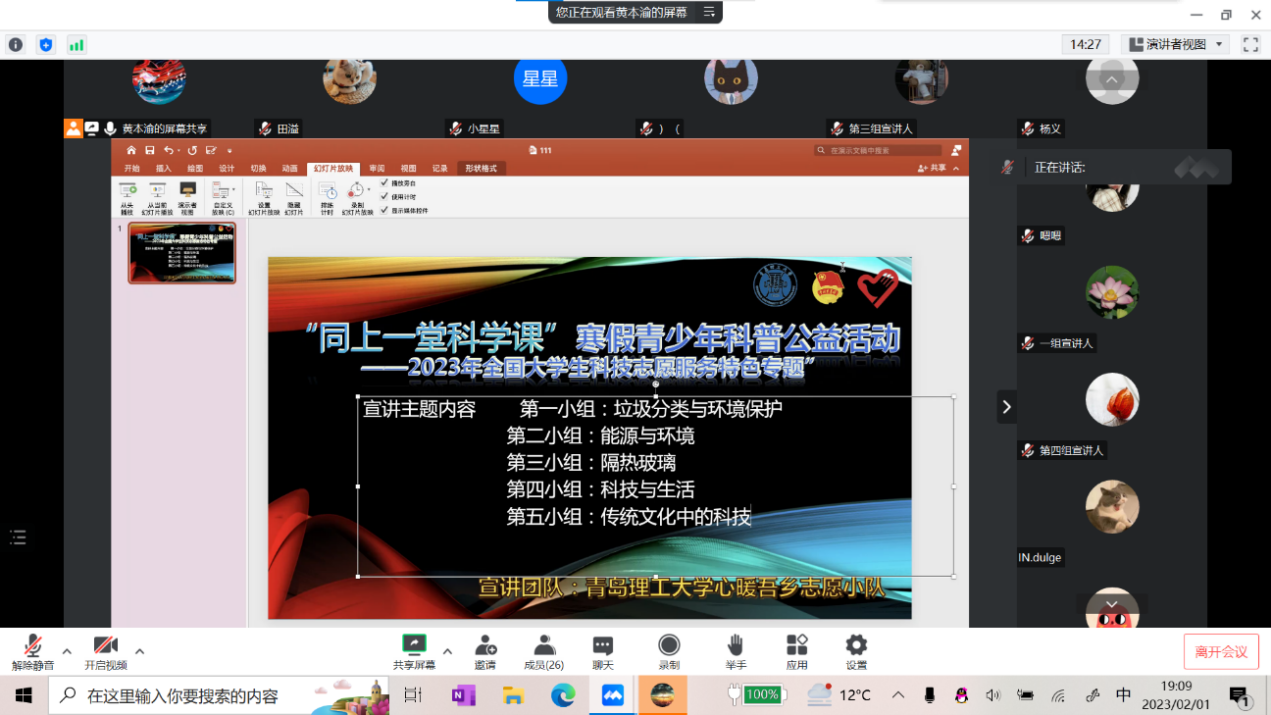 2月1日,“青岛理工大学心暖吾乡志愿小队”面向青少年儿童开展了线上宣讲。科普的主题包括:垃圾分类与环境保护、能源与环境、隔热玻璃、科技与生活、传统文化中的科技。志愿者们制作精美的演示文档,并充分准备宣讲稿,结合动画视频和有趣的卡通图片,用简单易懂的语言科普知识,为小朋友完成了宣讲。