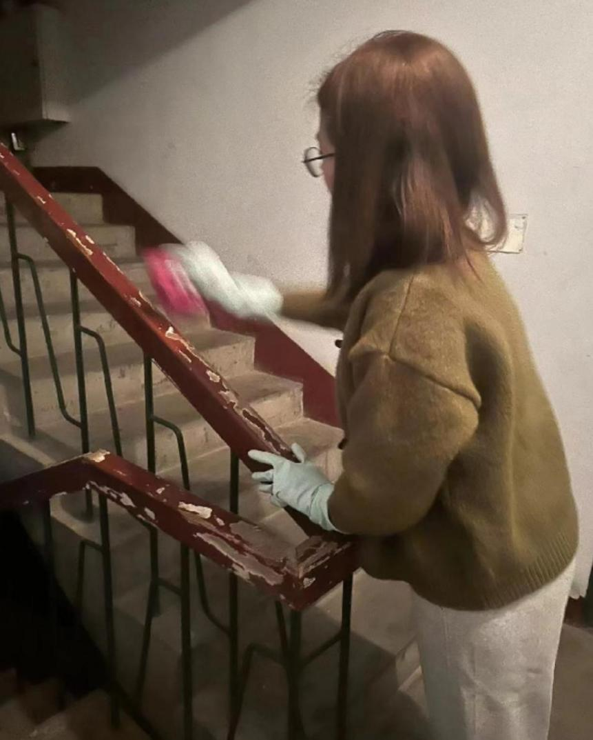 小组成员清理走廊扶手