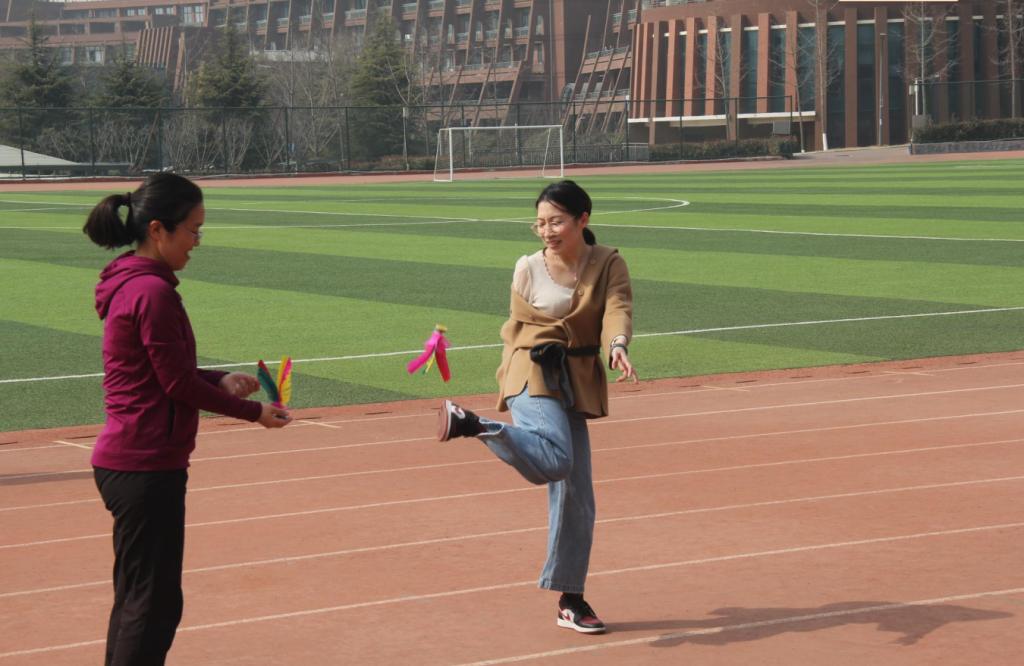 娱乐·较量——两分钟毽子。“轻移踏浪扬毽球,如风少年韧不休”,比赛进行到踢毽子环节。一只小小的毽子在老师们脚下来回跳跃,五彩的毽毛在空中飘逸地飞舞着。毽子比赛,既踢出了乐趣,也踢出了健康。肖宜华老师表示:“踢毽子让我回到了童年,感觉真是太开心了”。