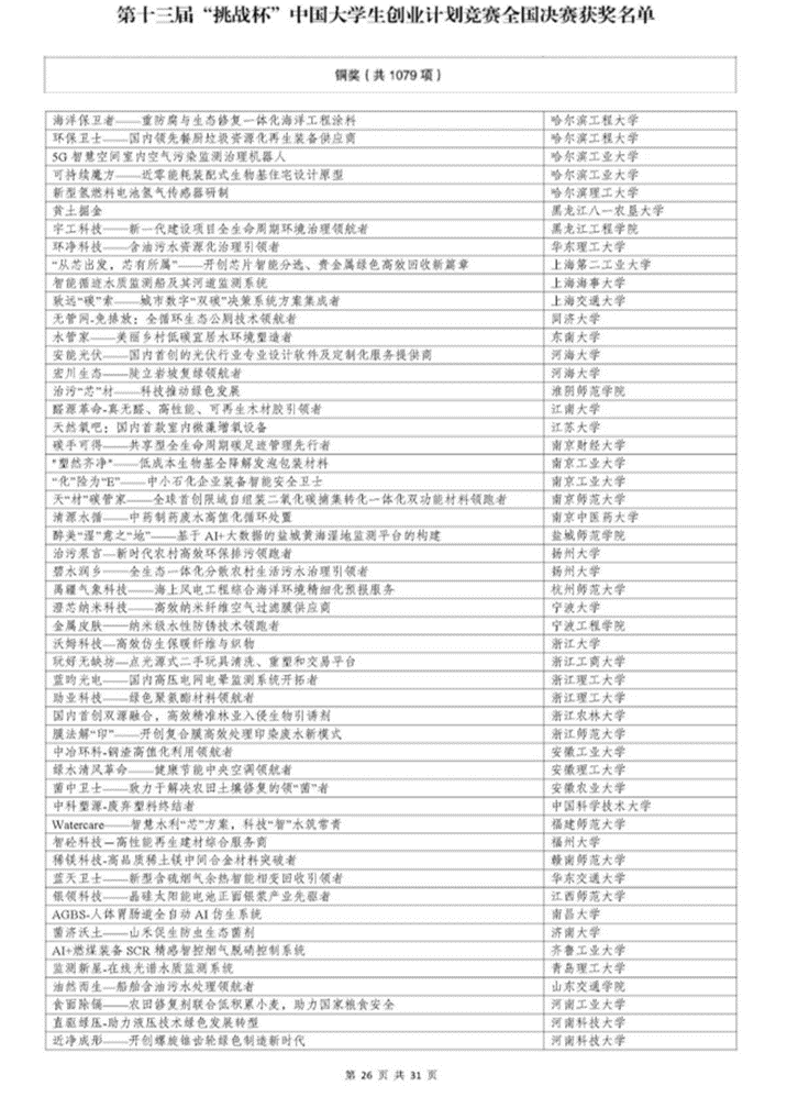 第十三届“挑战杯”中国大学生创业计划竞赛由共青团中央、教育部、人力资源社会保障部、中国科协、全国学联、北京市人民政府主办,由北京理工大学、共青团北京市委、北京市房山区人民政府承办。本届大赛聚焦为党育人功能、突出数字化办赛特色,共吸引来自3011所高校的142.4万名学生参赛,累计提交33万余个创新创业项目。经过校级初赛、省级复赛、全国决赛初评、全国决赛终评等环节,共评选产生金奖项目154个、银奖项目309个、铜奖项目1079个。
