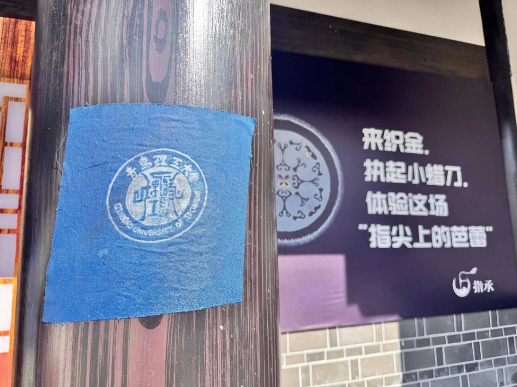 “我们希望这些成果不仅停留在纸面上,更能成为连接传统与现代的桥梁。”团队成员张嘉茜提到,他们已尝试将解码的纹样元素融入校园文创设计,团队创作的校徽蜡作品,最终呈现的蜡染校徽,是一件“以鼎为骨、以蜡为脉、以蓝为魂”的作品:鼎的轮廓承载高校精神,蜡染的纹样解码民族基因,蓝靛的色调连接山海情怀。通过蜡染这一具体媒介,让“铸牢中华民族共同体意识”变得可感可触。