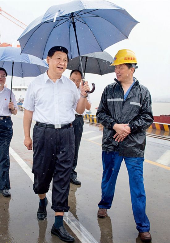 (2013年7月21日上午,习近平来到武汉考察,一下飞机就冒雨来到武汉新港阳逻集装箱港区。)