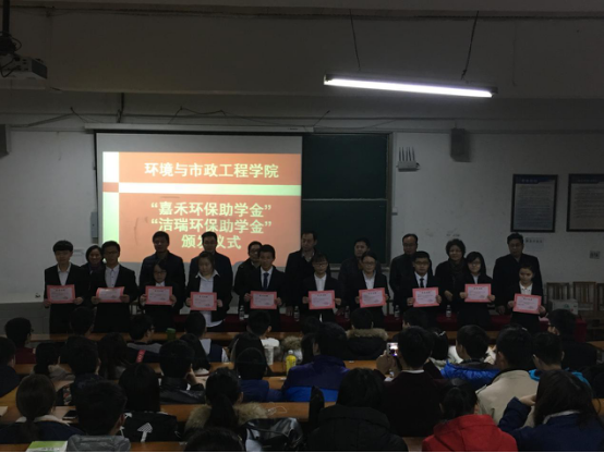 2016年12月16日,环境学院于一阶举行环工、环科专业“嘉禾环保助学金”、“洁瑞环保助学金”颁发仪式,教务处处长王在泉、宣传部部长陈伟、学生处副处长李忠晓、环境学院党总支书记董典同等老师出席,环境学院党总支副书记周红燕主持仪式。