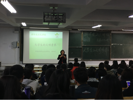 为进一步提升环境学院学生的文明修养,4月7日,环境学院组织了新环境成长讲坛第32讲-“大学生的文明素养”主题讲座,学院党总支副书记周红燕主讲,2015级辅导员岳磊老师和年级全体学生聆听了讲座。