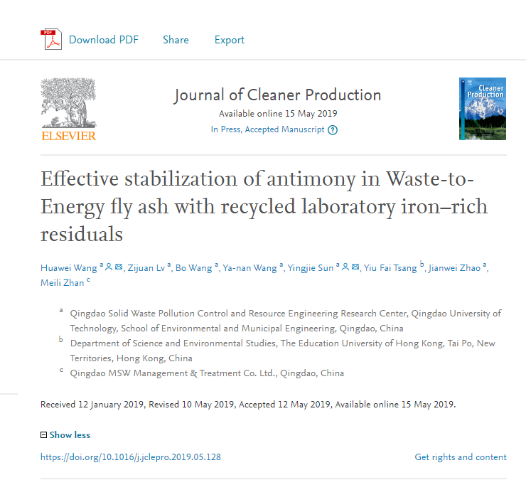 近日,我校yl23455永利固体废物污染控制与场地修复创新团队王华伟博士在环境工程领域国际权威期刊《Journal of Cleaner Production》上发表最新科研成果“Effective stabilization of antimony in Waste-to-Energy fly ash with recycled laboratory iron-rich residuals”(DOI:10.1016/j.jclepro.2019.05.128)。