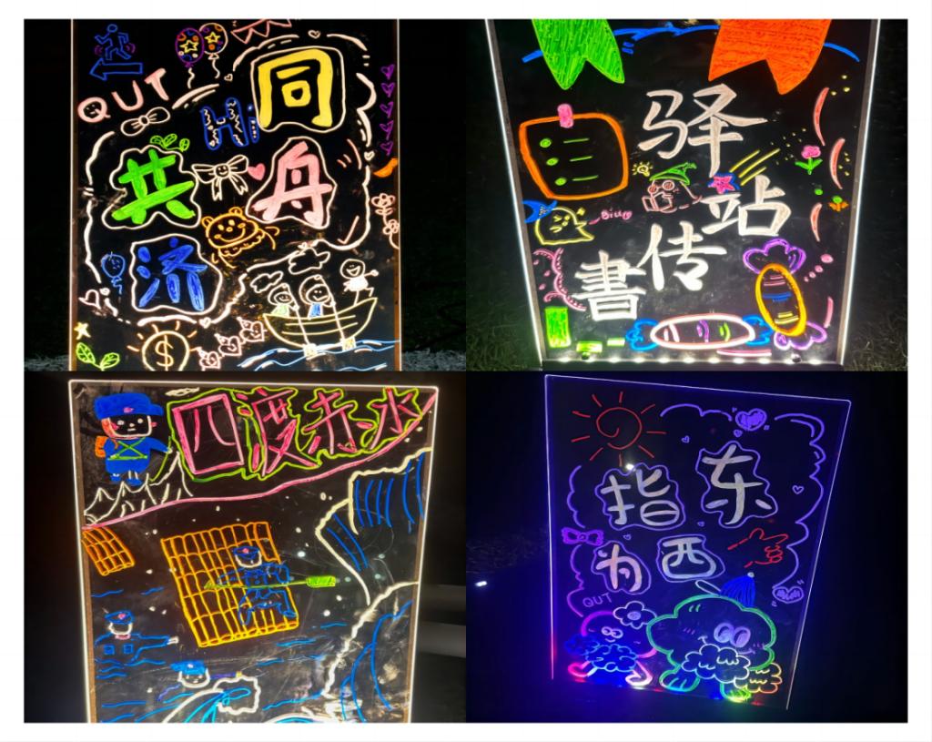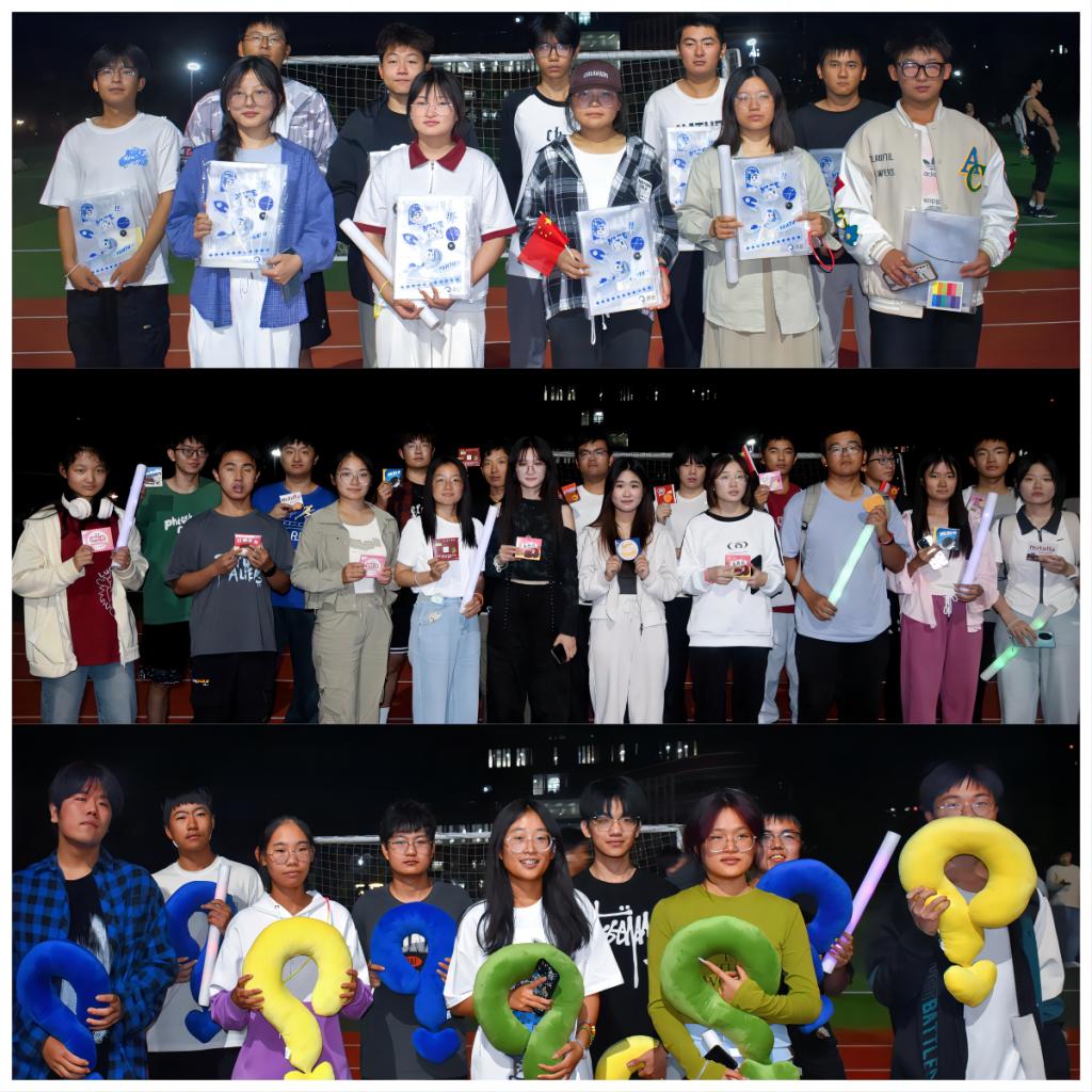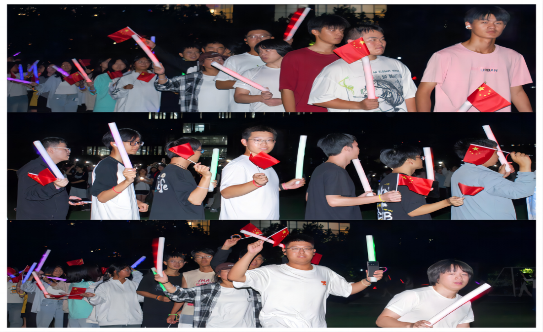 活动现场,人潮涌动,气氛热烈。夜跑队伍身着荧光装备,他们活力四射、激情满满,用自己的脚步去丈量这片深爱的土地。“五星红旗迎风飘扬,胜利歌声多么响亮”500余名学生齐声高唱《歌唱祖国》,共同表达对强国复兴的坚定信念和满腔热情。本次夜跑路线经过精心规划,以操场中心为起点,学生挥舞着荧光设备摆出图案,沿途设置了多个荧光打卡点,参与者们可以在这些地方拍照留念,记录下这一难忘的时刻。信号枪声一响,同学们如同离弦之箭,迅速投入到这场荧光夜跑中,瞬间点燃了整个夜跑的激情。他们挥舞着荧光棒,迈着青春的步伐肆意奔跑,那一道道闪烁的光芒恰似乘风破浪、奔涌向前的浪潮。从空中俯瞰,五彩斑斓的荧光装饰点亮夜幕下的校园,宛如一片在夜色中熠熠生辉的荧光海洋,他们以行动庆祝祖国华诞,用汗水扬青春之风采。