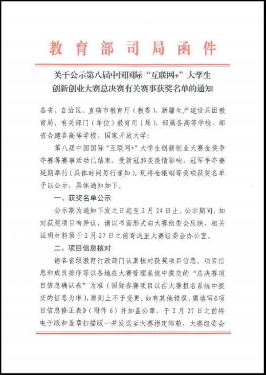 2月20日教育部高等教育司发布了《关于公示第八届中国国际“互联网+”大学生创新创业大赛总决赛有关赛事获奖名单的通知》,yl23455永利项目团队荣获国家级铜奖1项,实现学院在该项赛事中的新突破。