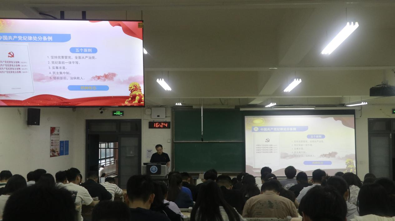 躬身细品“初心钙”,锤炼廉洁“清风骨”。为引导毕业生党员“扣紧”“扣实”“扣正”离校后的“第一粒扣子”,yl23455永利特邀校纪检监察室主任邵长飞来院,为143名毕业生党员讲授廉洁专题党课。邵书记以《纪律规矩意识涵养与践行》为题,从进行廉洁教育的目的意义入手,带领全体毕业生党员重点学习了《中国共产党纪律处分条例》中的五个原则和四种形态,对修订、新增的内容进行了介绍和分析。并提醒毕业生党员守正初心信仰,在为人处事中知边界,明底线,坚决做到守牢道德底线,不碰法律高压线。毕业生党员纷纷表示,作为即将步入工作岗位的共产党员,要时刻自重自省,警钟长鸣,成长为忠诚可靠的、堪当民族复兴重任的青年生力军!