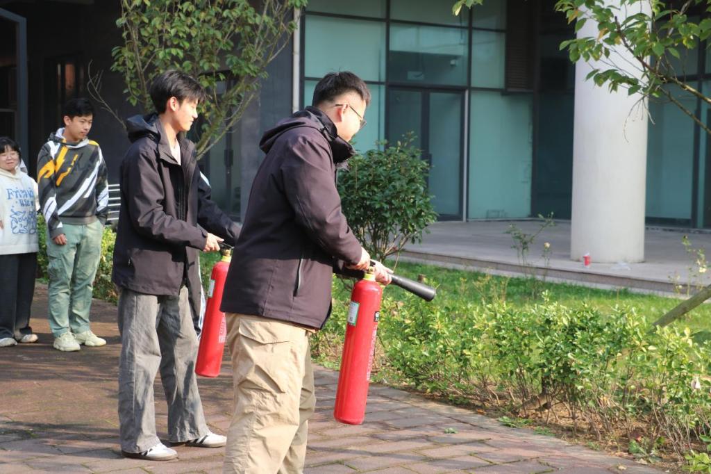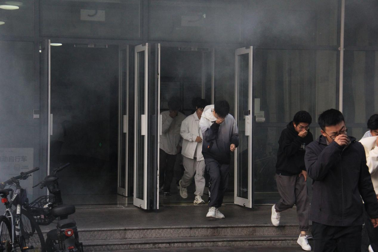 实验楼培训提能力 学院于C2-4实验楼组织了实验楼消防安全应急疏散演练及灭火器使用培训。参与演练人员包括学院师生共三十余人。大家按照疏散路线,穿过浓雾,迅速、有序地撤离至实验楼北侧空地。之后,学校安全管理处的老师详细讲解了干粉、泡沫、二氧化碳三类灭火器的使用方法及注意事项,针对灭火距离、喷射部位等要点进行现场科普教学。现场的同学们进行了二氧化碳灭火器的实操演练,亲身体验了使用流程。