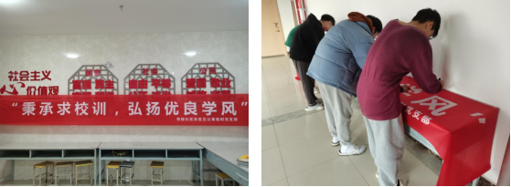 签贴“诚信幅”,考试纪律记心底。为树立诚信考风,临时党支部组织动员公寓同学举办了诚信考试横幅签字活动。临时党支部副书记王九遵在本次横幅签名倡议仪式的重要意义中强调:“诚信是对道德品质的检测,创造公平,公正的考试环境是我们共同的责任。用实际行动维护考试的公平、公正,是我们每位考生的义务,需要我们共同参与。”此次诚信横幅签名倡议活动帮助社区内同学树立了“秉承求校训 弘扬优良学风”的正确考试观,弘扬了中华民族的传统美德。