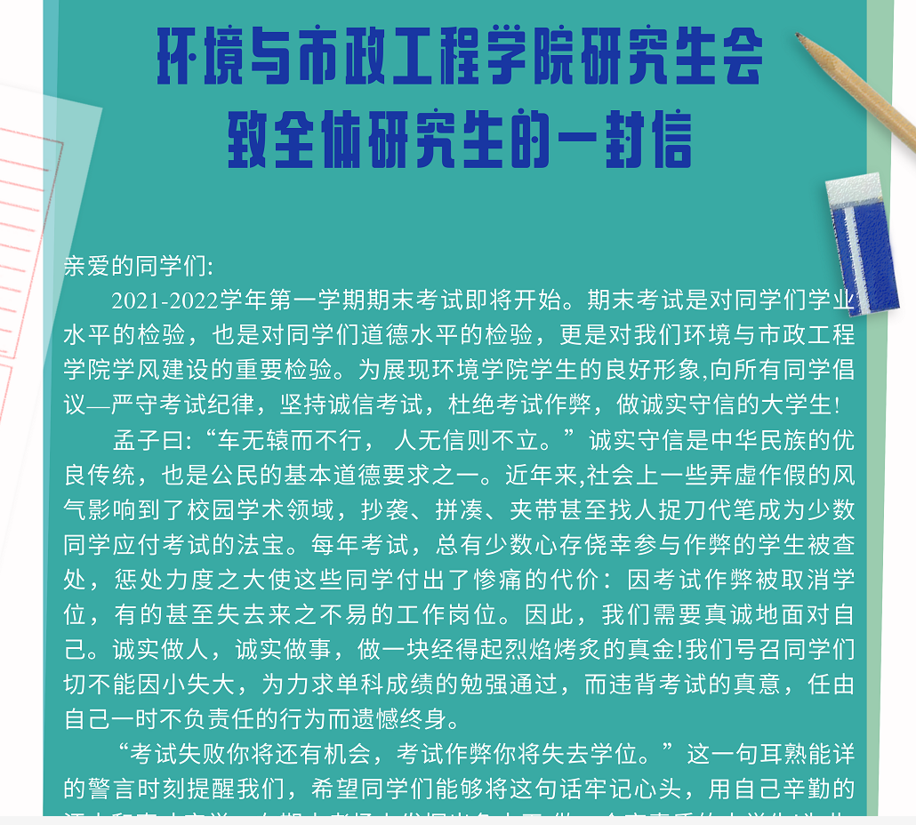 临近考试周,研究生会第一时间通过纸质及线上的方式向学院学生发布了诚信考试、抵制学术不端倡议书,并在1月份开展“弘扬诚信学风”宣讲会。学院研究生会主席、环研2004班党员李建凯作为主讲人,分享了各高校关于科研精神的先进事迹,讲述近年来各高校学术不端的典型案例,对照学校学生考试作弊、学位论文造假处理办法的相关条例及处理方式进行讲解。最后,参会同学就“作为研究生我们应该具备怎样的科学精神和学术道德”的问题进行了热烈的讨论。