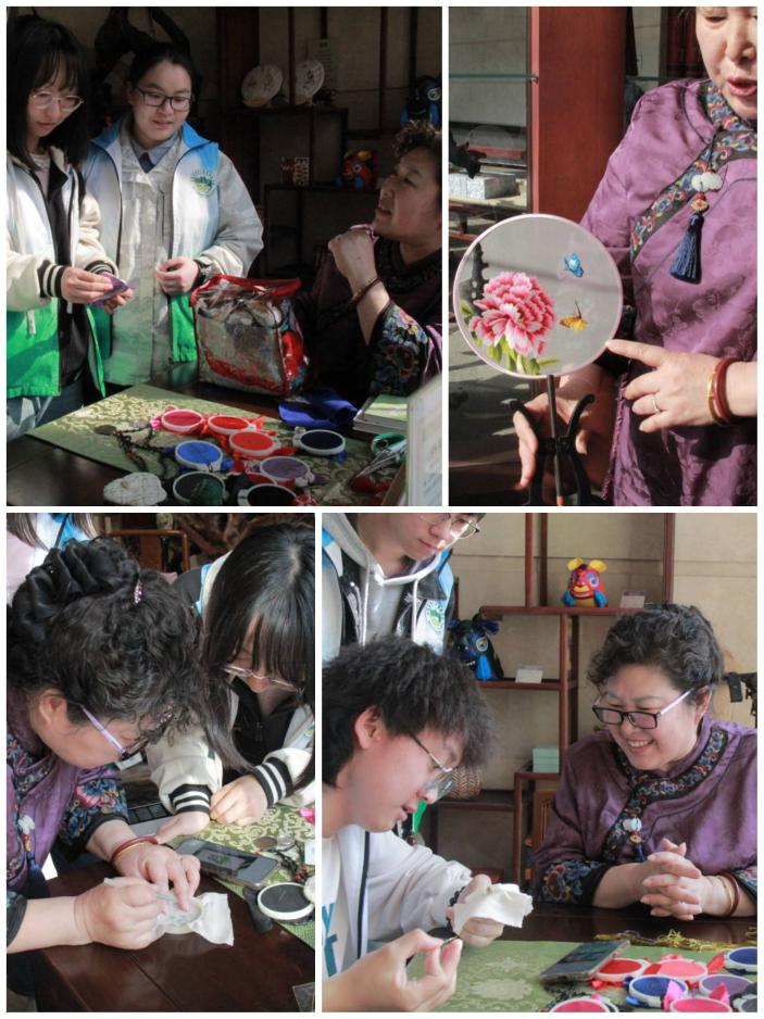 齐绣作为鲁绣的分支,距今已有2000多年的历史传统的齐绣以蓝色、紫色等色调为主,有盘金绣、平绣、双面绣、乱针绣等多种针法,每幅作品针法不同,就会产生油画、水墨画、工笔画等各种效果,齐绣绣工精细,很有地域特色。”齐绣非遗传承者黄凤老师的弟子刘老师向志愿者们介绍道。常龄玉作为学生代表,深入学习了齐绣工艺技艺,在非遗传承人刘老师的指导下,经过一针一线、一穿一绕,以针代笔,以线为色,一个精美的荷包呈现在大家面前。常龄玉同学表示,“在刺绣的过程中,我的内心慢慢变得平和,在这一针一线间我感受到中华传统文化的魅力,更加体会到劳模工匠身上执着专注、敬业奉献、追求卓越的精神品质。”